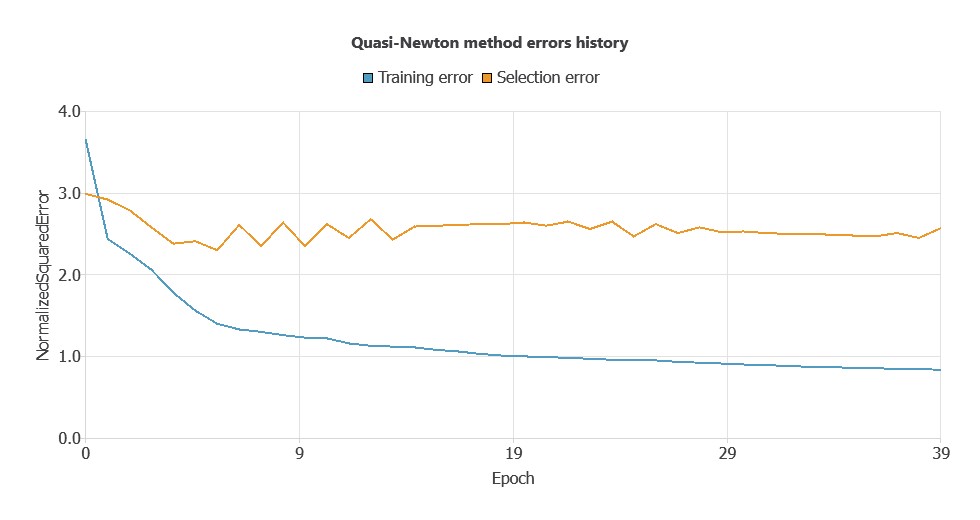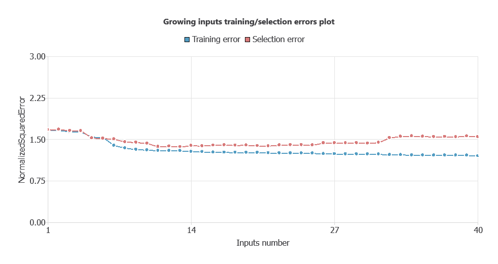 After performing input selection, the model was reduced to 35 inputs (removing less relevant features), which lowered the selection error and simplified the network architecture.