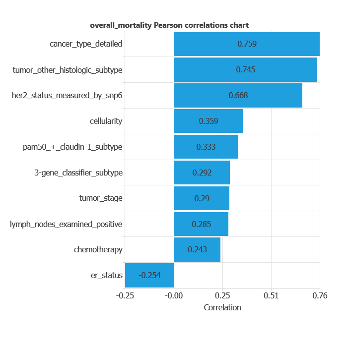 Here, the most correlated variables with mortality are cancer type, detailed tumor other histologic subtype, and HER2 status measured by SNP6.