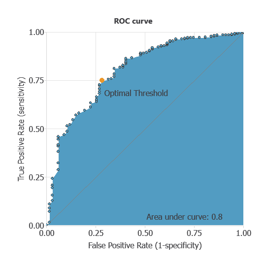 The AUC obtained is 0.8, showing that the model performs exceptionally well at distinguishing between patients who survived and those who did not.