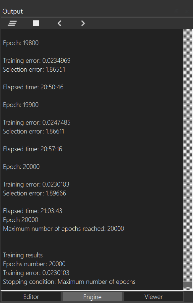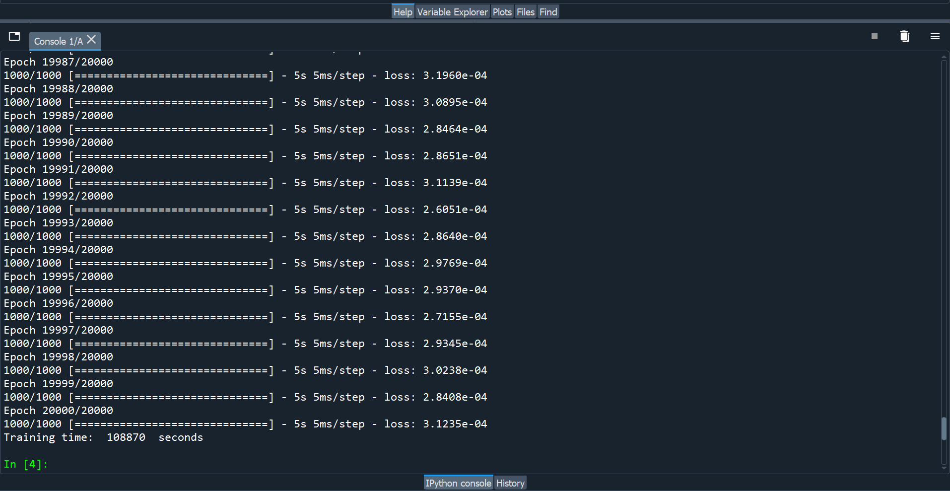 As we can see, TensorFlow takes 30:14:30 to train the neural network for 20000 epochs (5.44 seconds/epoch).
