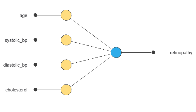 The network uses five patient variables—age, systolic and diastolic blood pressure, cholesterol, and ID—to predict the probability of developing diabetic retinopathy, with connections showing each variable’s contribution.