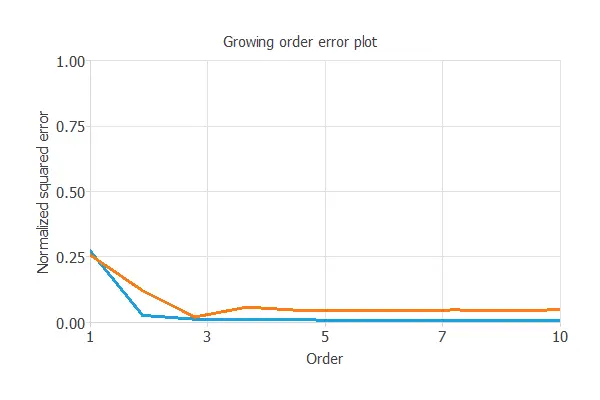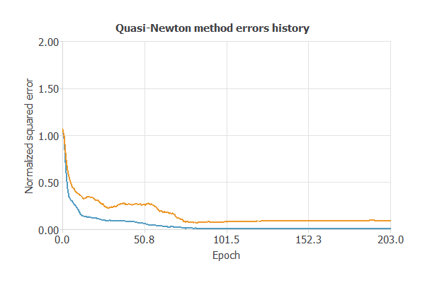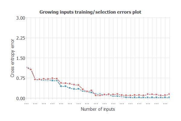 The neural selection method starts with a few neurons and increases the complexity at each iteration.The following chart shows the training error (blue) and the selection error (orange) as a function of the number of neurons.