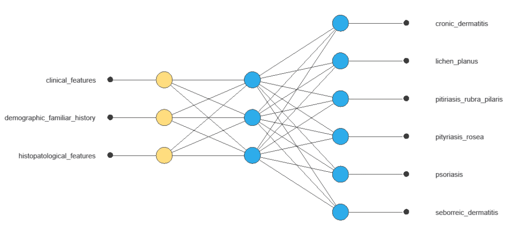 The network combines multiple inputs in a hidden layer to produce six outputs corresponding to different dermatological conditions, with connections showing each variable’s contribution.