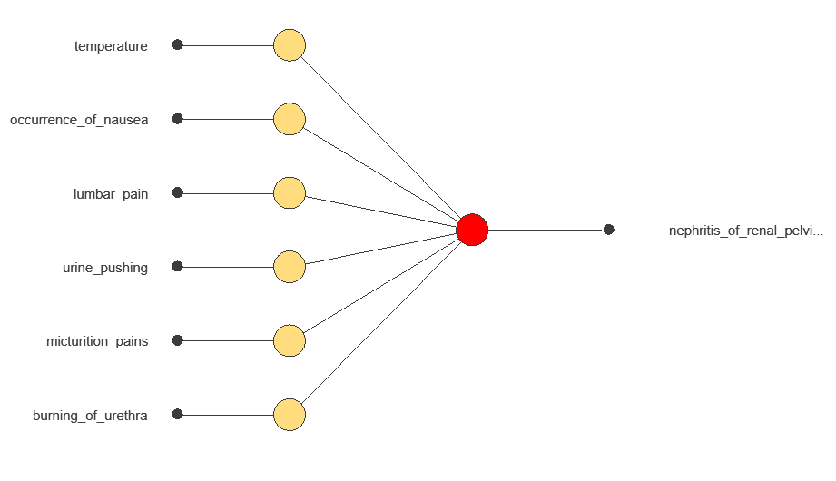 The network processes six diagnostic variables and produces a single output: the probability of developing nephritis of renal pelvis origin.